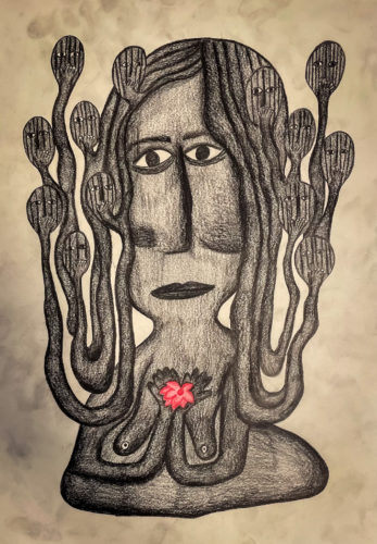 Through her painting, Samaneh focuses on women—their lives, their experiences, their strength and their power. She mainly works in ink and markers on paint and canvas. “To fulfill my mission and my objectives, I want to be the voice of the women of my country, narrator of their histories,” she says. “I paint the true lives of Iranian women. I tell about my life and the lives of millions of women like me. I express the facts and the unjust situation of Iranian women. I am an ordinary woman who fights every day for the most fundamental, simple, and basic rights. My truth is to be able to be myself, and that is my daily effort and that of all Iranian women.”