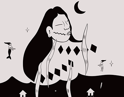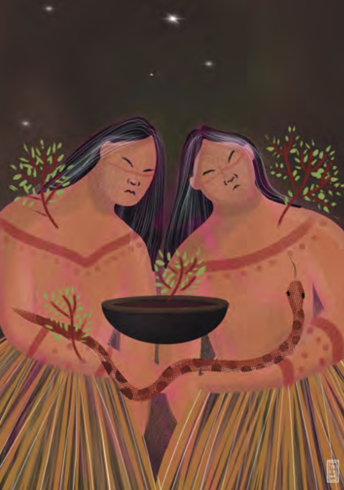 This show set on her current path. As a digital illustrator with more than 22,000 Instagram followers, Yucanã is known for her powerful depictions of womanhood, queerness, ancestry, memory, and indigenous culture and life—on her own terms and rooted in her own experiences. Her art frequently depicts her ancestors, often intertwined with imagery of the earth and nature: rivers, oceans, plants, forests. She shares moving snapshots of Tuxá life and history: their old village, their displacement, and the rivers that were so integral to their way of life. Through her art and its accompanying captions, she shares ancient stories and enduring beliefs that have been passed down through generations. With each and every illustration, Yacunã can feel herself creating hand in hand with her ancestors. “I create with my little hand here,” she says, “but there are many other hands together with mine. It’s a collective: my people, my land, my community.”