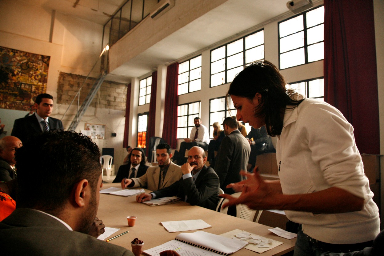 Daccache works with prisoners at Roumieh Prison during rehearsals for the 12 Angry Lebanese stage production in 2009. Photo credit: Dalia Khamissy/ Catharsis-LCDT